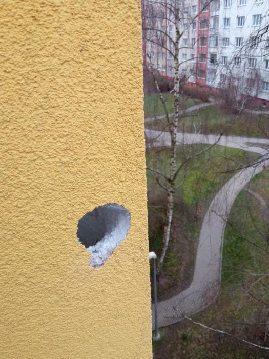 Poškozená omítka, díry od ptactva, strakapoud a datel.