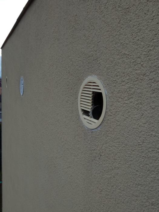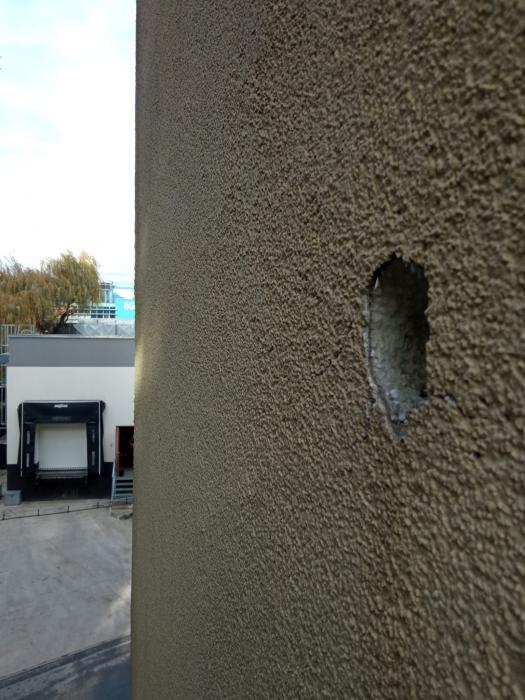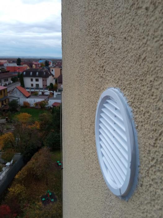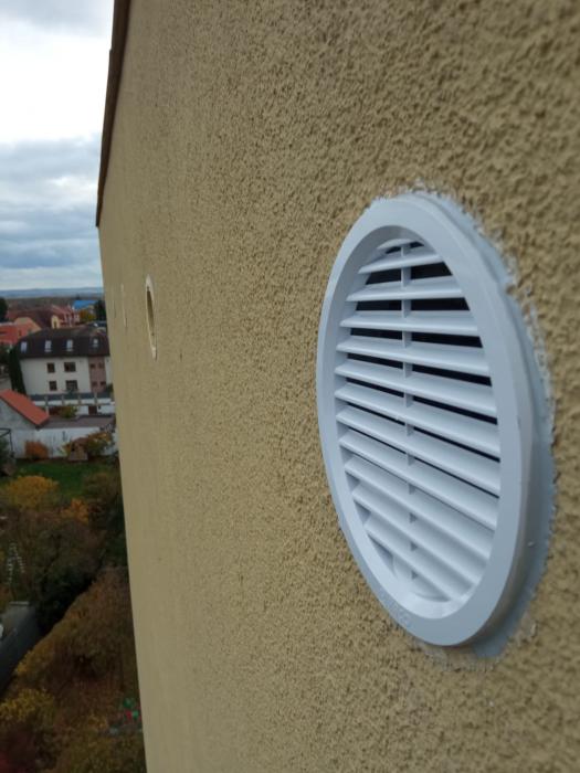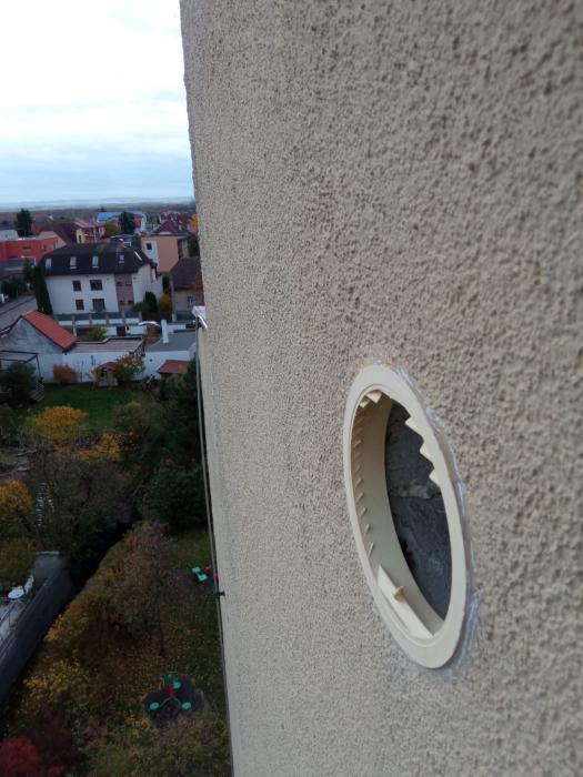 Výměna vyklovaných větracích mřížek, oprava poškození omítky po ptácích.