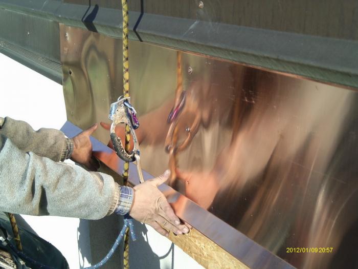 Výměna oplechování štítu nad střechou sousedního domu, kam se kolegové klempíři nedostali...