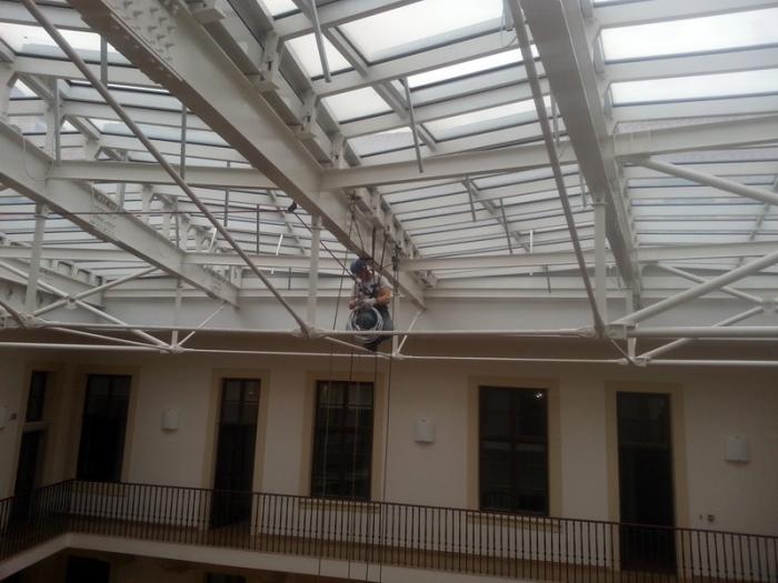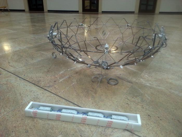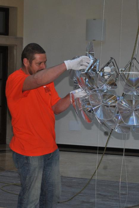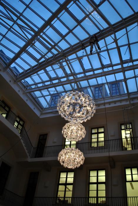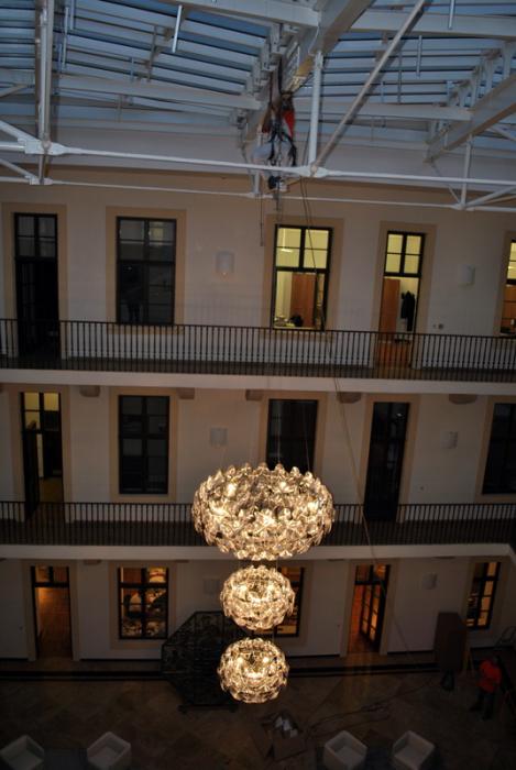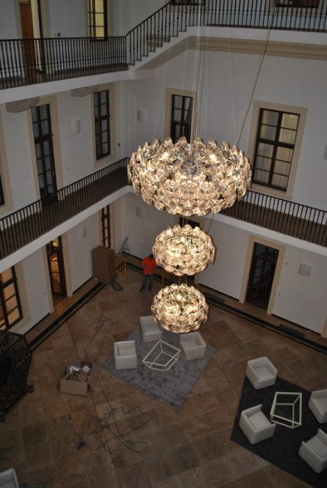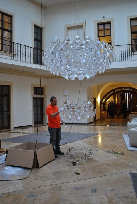 Výroba kotvení, elektroinstalace, kompletace a montáž dálkově ovládaného lustru v Trauttmansdorffském paláci v Praze 1 - sídle Matonni. Zima 2013.