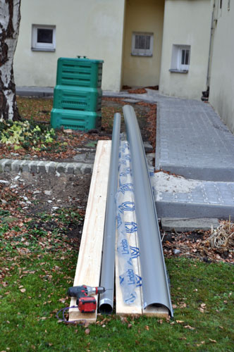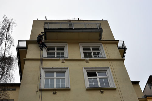 Dodatečná montáž atypických okapů a svodů na balkóny bytového domu. Nestandardní způsob ukotvení háků vyřešil systém od firmy Lindab.