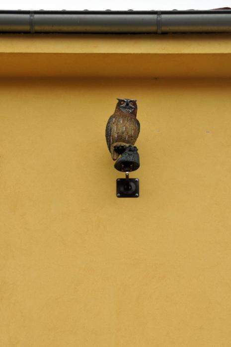 Oprava zateplené fasády poškozené datlovitým ptákem + montáž 3ks maket výra. Braškovská, Praha 6, listopad 2014.