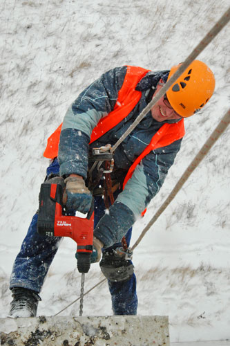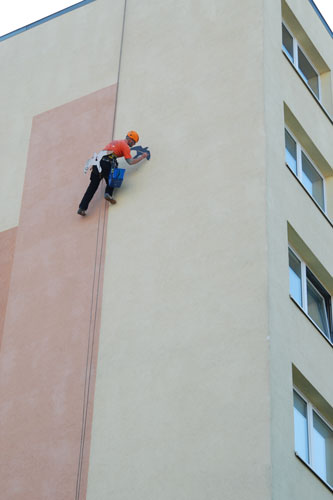 Oprava děr v polystyrenu, vytvořených nějakým šplhavcem. K odrazení nevítaného návštěvníka jsme na fasádu namalovali siluety dravců.