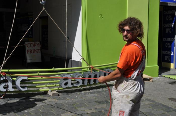 Demontáž, nátěr a zpětná montáž konstrukce s novou světelnou reklamou - pasáž Yasmin, Praha 1.