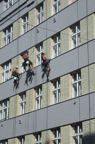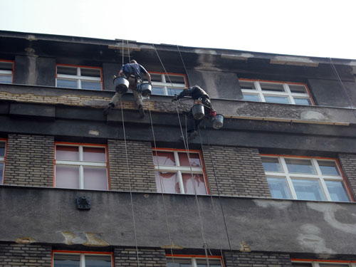 Omítka bytového domu v Uralské degradovala především vlivem zatékání zkorodovanými parapety.