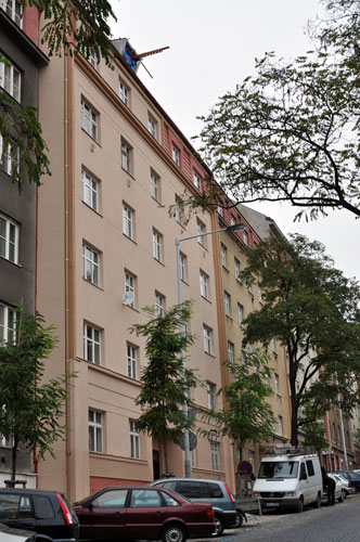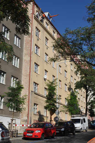 Oprava a nátěr fasády bytového domu na Vinohradech. Římsu bohužel opravovali nějací kolegové "výškaři" před námi. Bylo nutné otlouci opravy až na cihlu a udělat vše znovu. Rovně. Fasáda je ošetřena základním nátěrem SilicatePrimer a natřena barvou Revitalcolor Silicate.