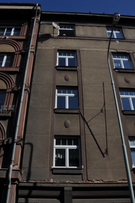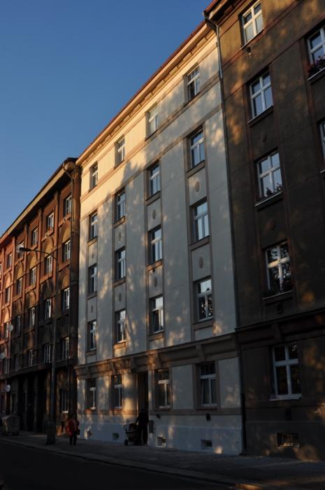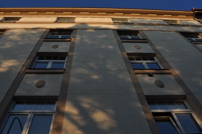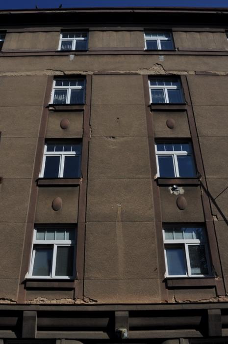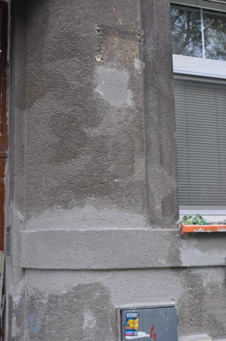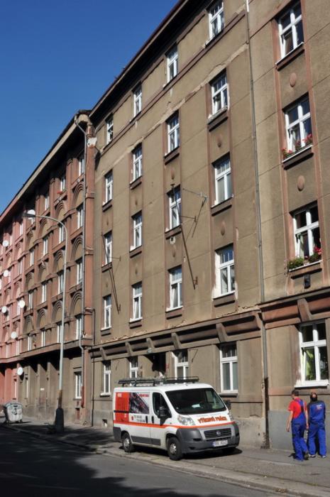 Dům z roku 1925 s fasádou v původním stavu. Omítka poškozena cca na 20% plochy - zatékalo poškozeným oplechováním.