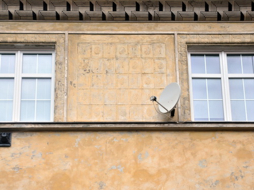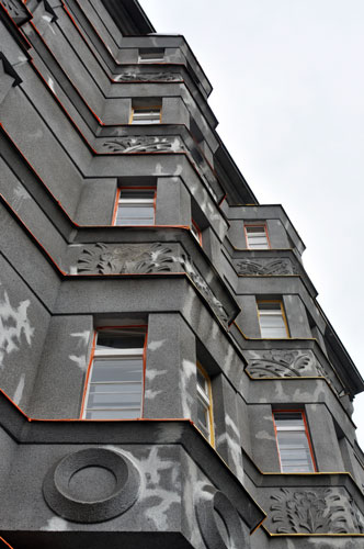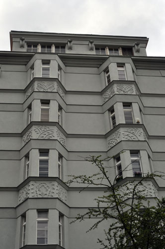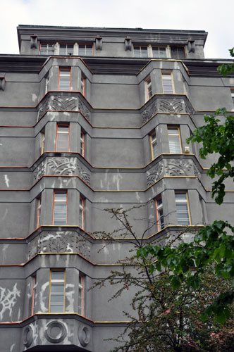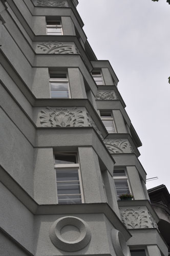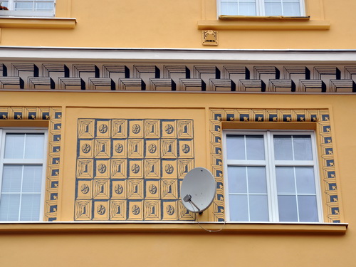 Oprava fasády s poškozeným rondokubistickým zdobením. Rekonstrukce štukových prvků, hloubková penetrace celé plochy fasády a nátěr paropropustnou barvou Jubosilcolor Silicate - vhodnou pro památkově chráněné objekty.