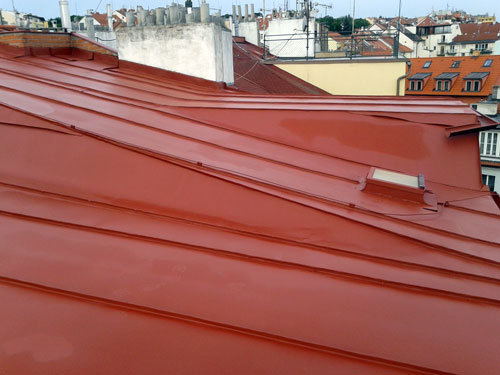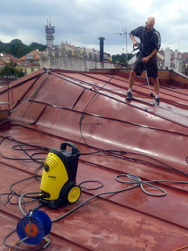 Očištění a antikorozní nátěr plechové střechy na Břevnově.