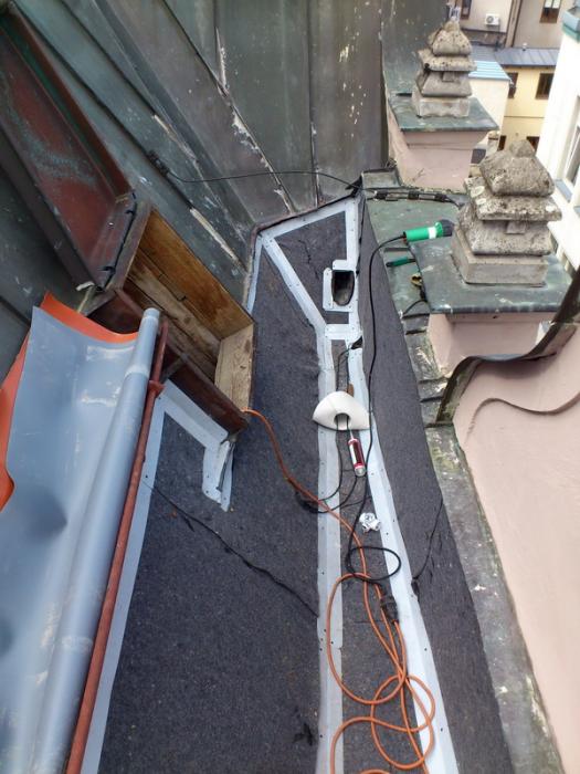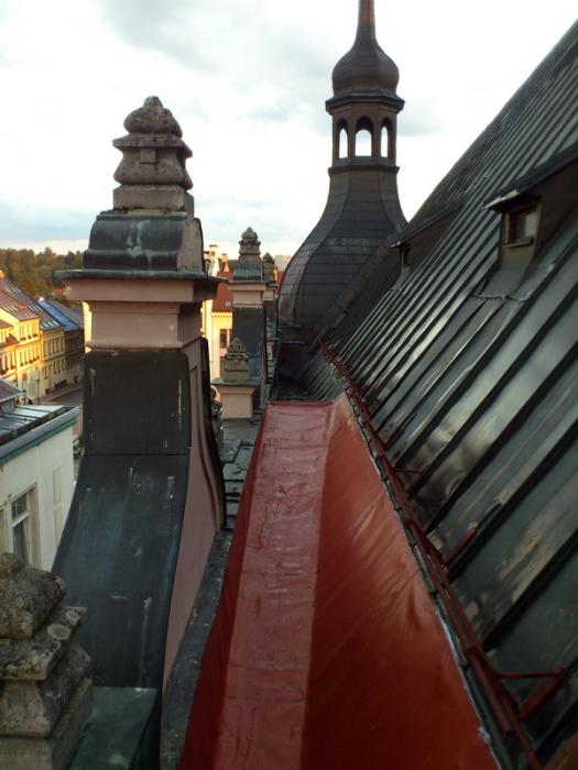 Původními měděnými žlaby vlivem dilatace ve falcovaných spojích opakovaně zatékalo do kancelářské budovy. Byli jsme požádáni o vytvoření ekonomicky přijatelného řešení. K výrobě "žlabu nad žlabem" jsme použili PVC krytinu Fatrafol určenou pro ploché střechy, hydroizolace teras apod.