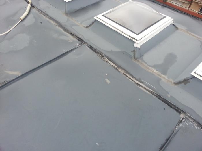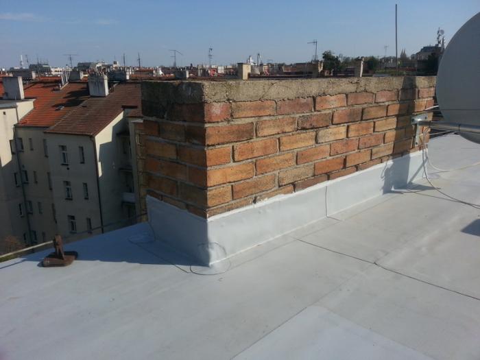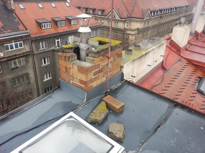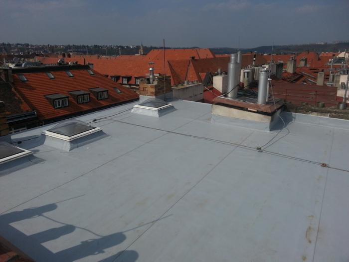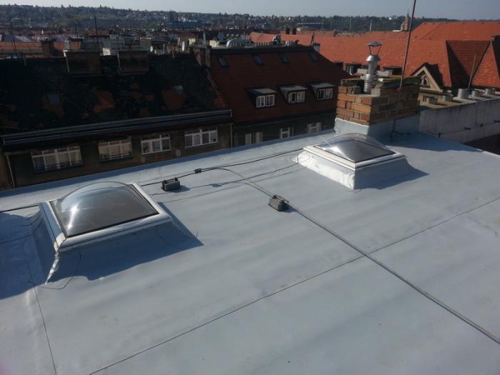 Po opakujících se problémech s protékáním se majitel bytového domu rozhodl vyměnit starou falcovanou krytinu za PVC krytinu Alkorplan. Realizace na jaře 2013.