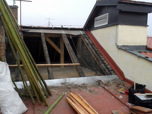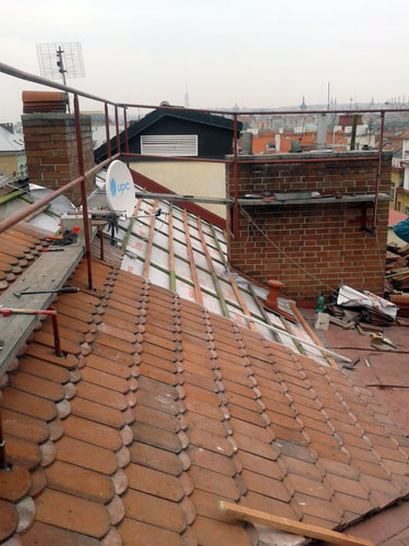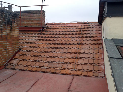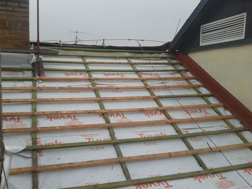 Střešní krytina byla demontována, natažena difuzní fólie, nově zalaťováno a krytina položena zpět.