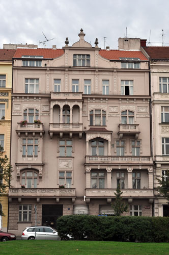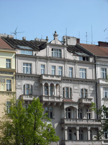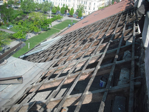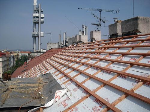 Kompletní oprava střechy bytového domu na Náměstí Jiřího z Poděbrad.